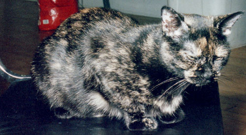 Caboodle came to us very pregnant and about to be sent for a swim in the river with some concrete shoes. Seems she had been living in the Watch Factory boiler room, catching her own birds there. Then she got pregnant. When the Mayor (as we called him) of the Watch Factory caught on to this, it was "Out of here!" Hector the building janitor brought her to us, and we ended up adopting her. Mim took one of her kittens (skooter).
