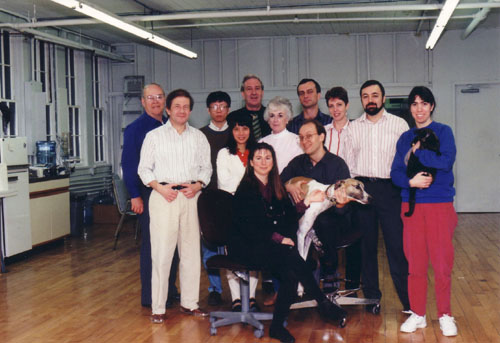 This first image was in our Millicarat engineering heyday, 1994~5. Left-to-right were Steve - Leonid - Nam - Hai Dung - Bill - MarianD - Mim - Vova (in the rear) - JB - Happy Dog - Inna - Igor - Marian A - holding Loki the CEO (Cat Executive Officer).